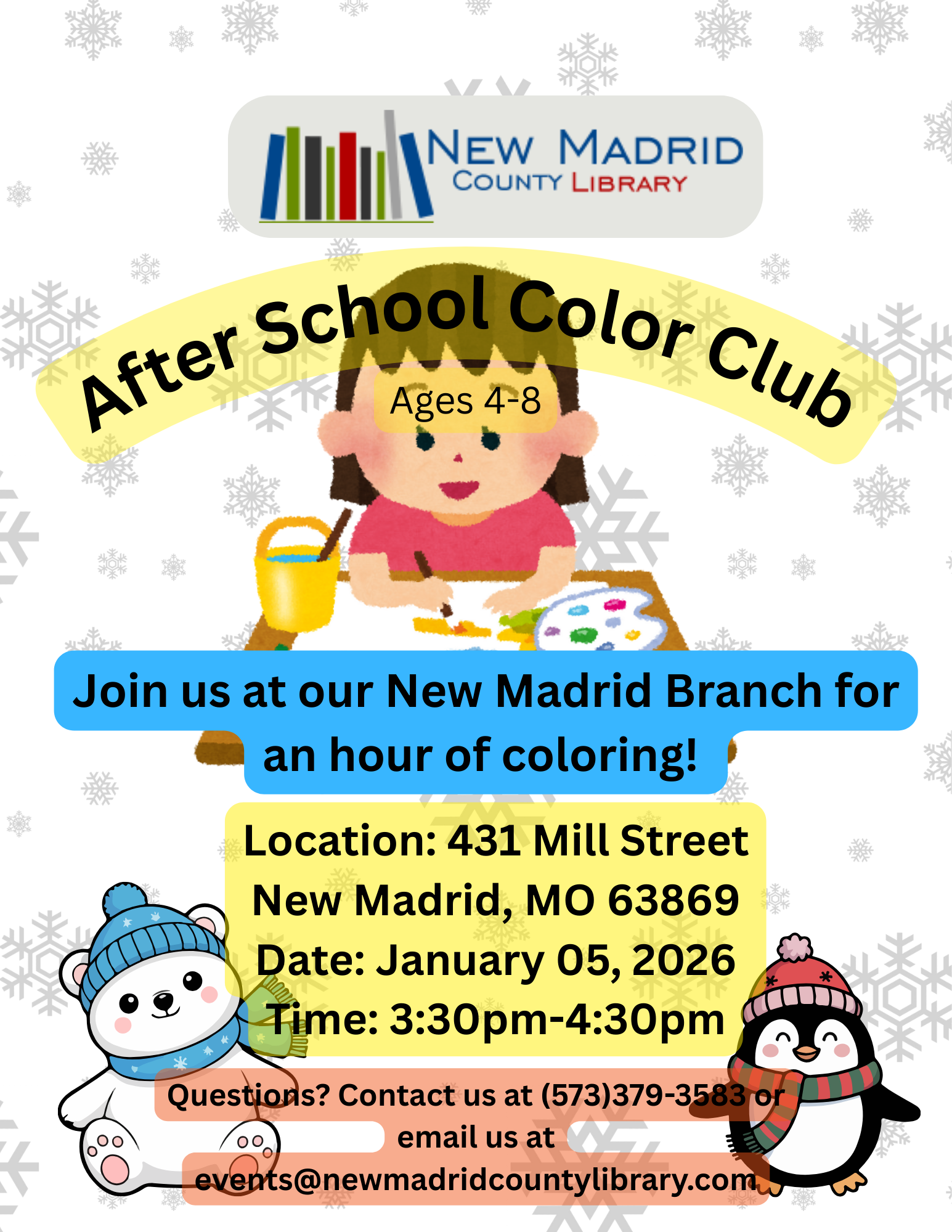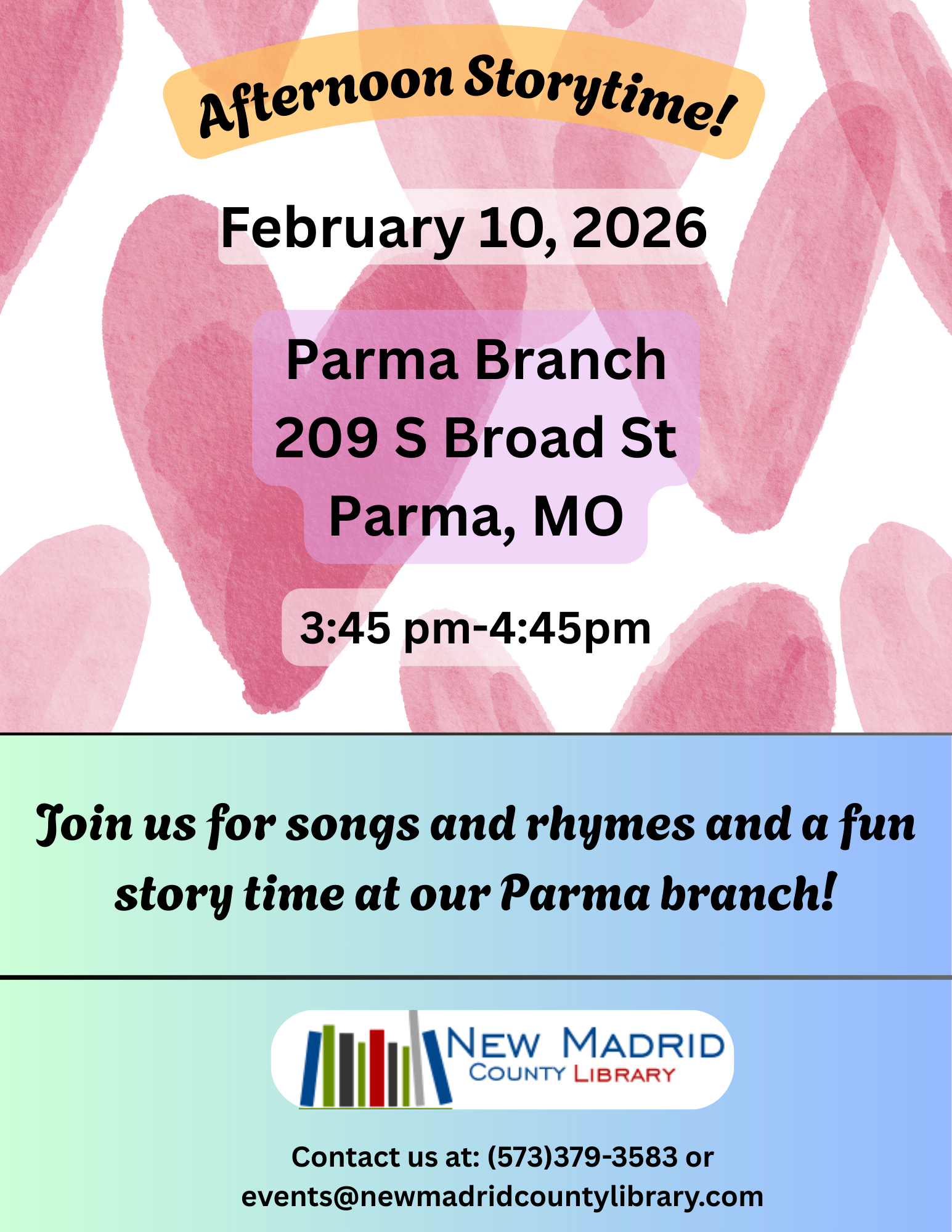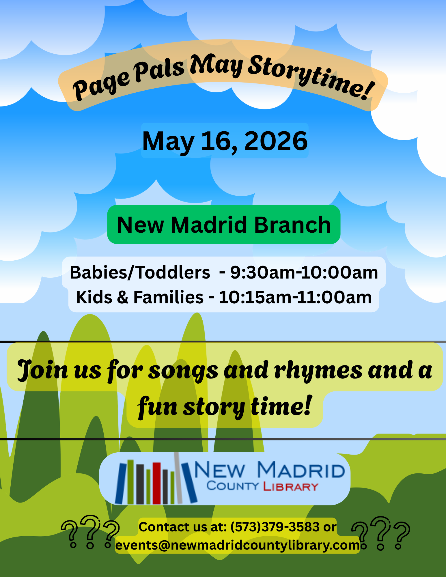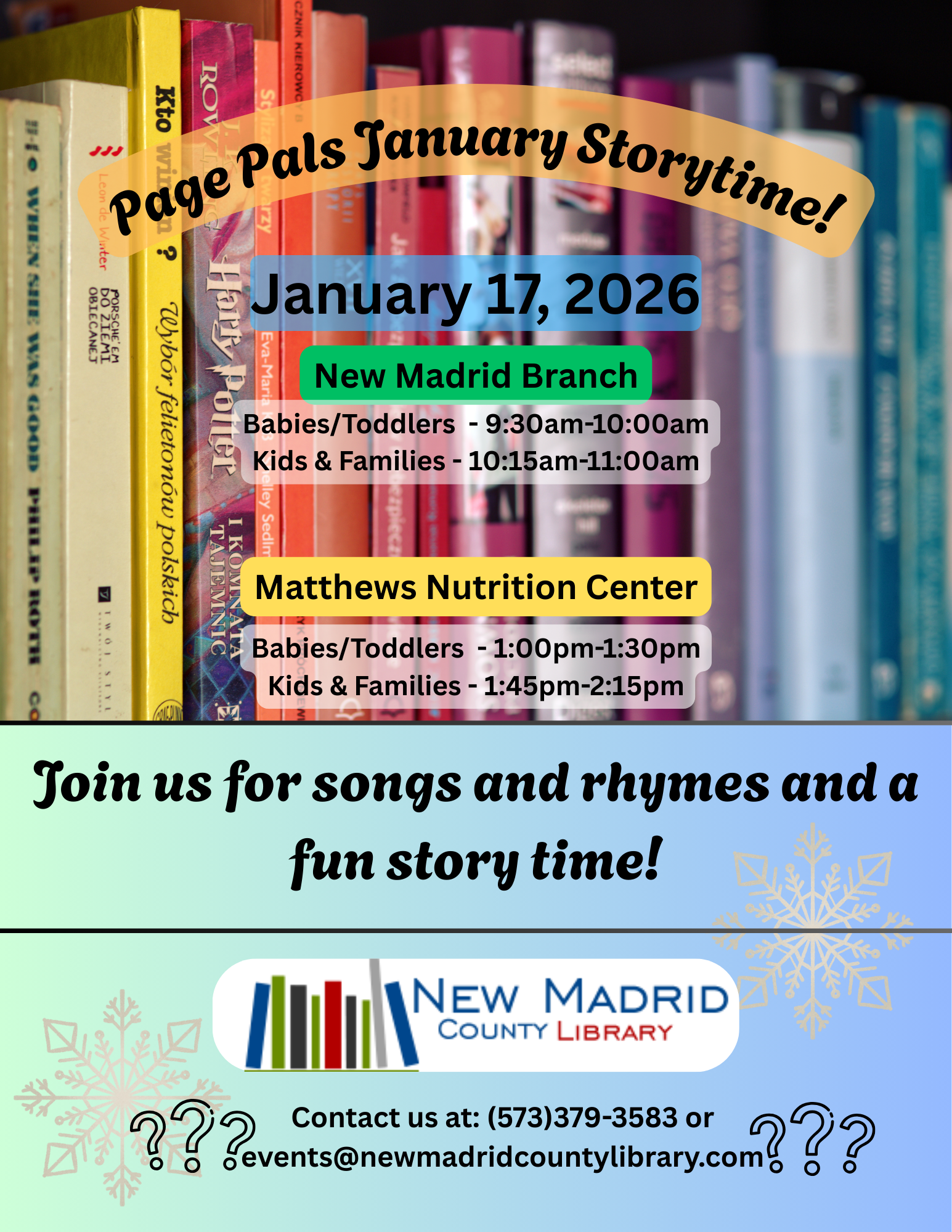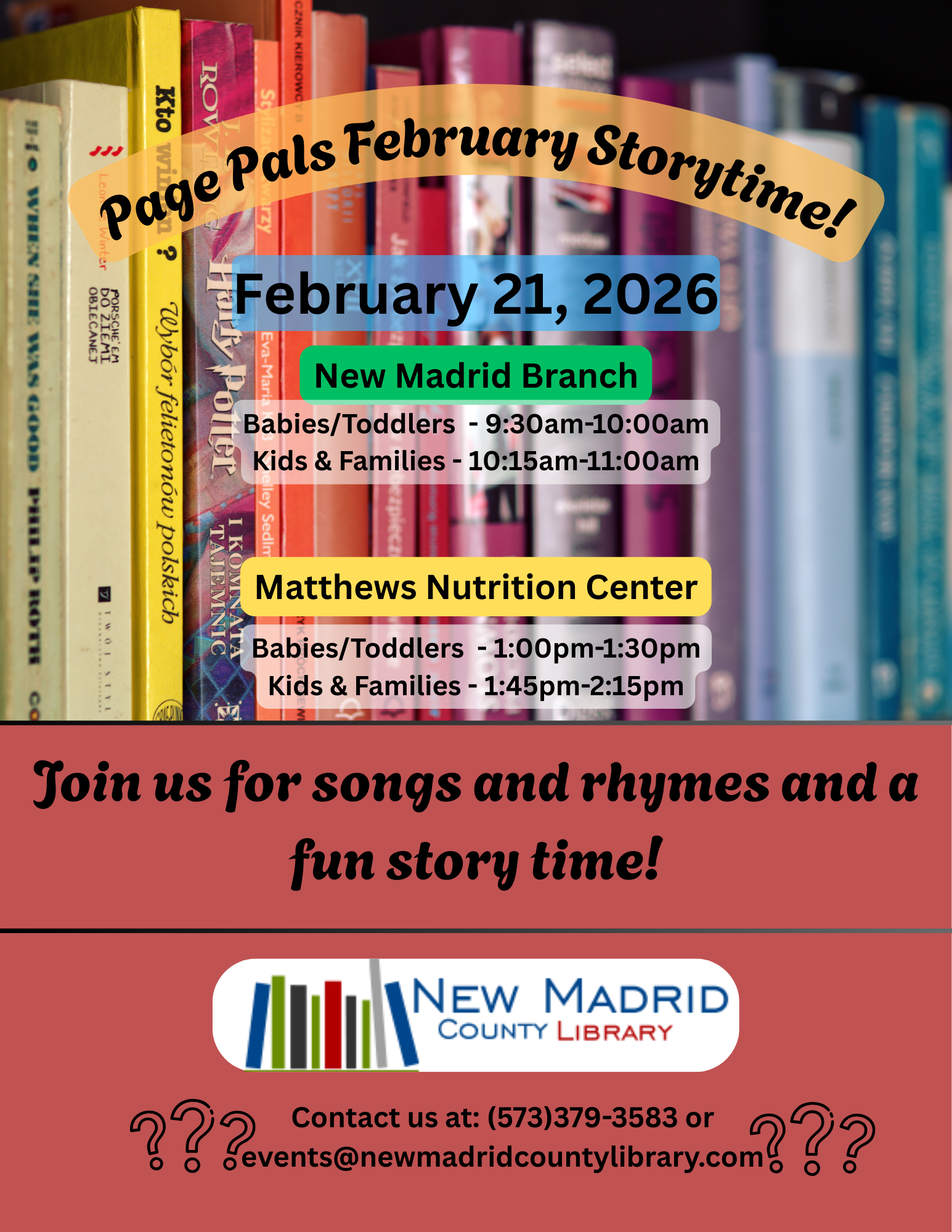 On this page you will find information for upcoming events at our branches and throughout the county. Questions? Email us at events@newmadridcountylibrary.com