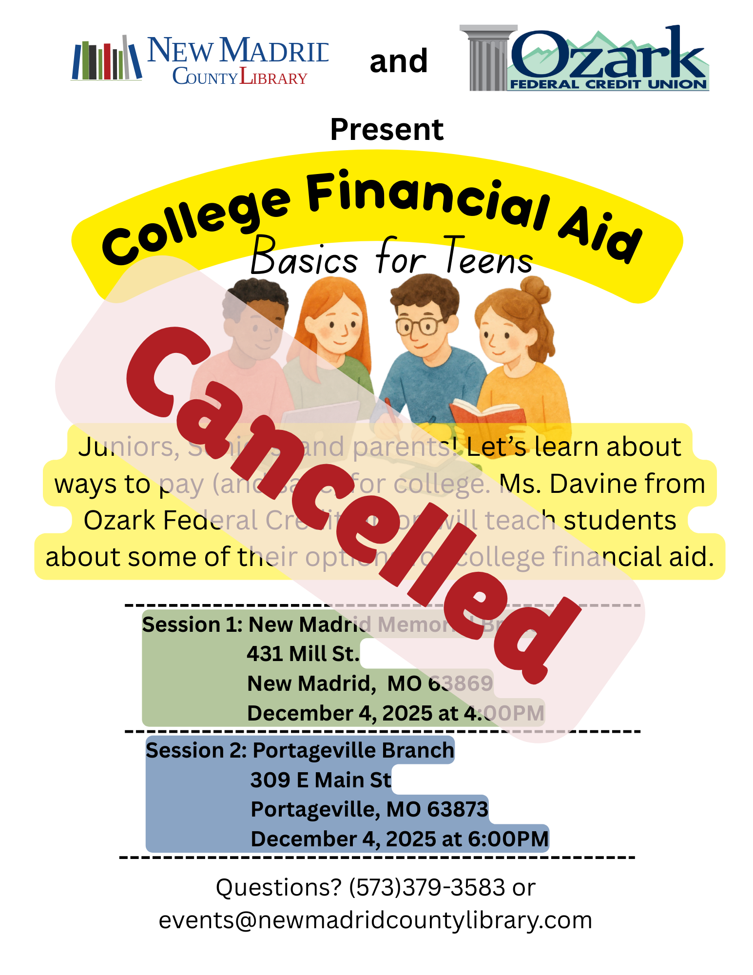 It may be December, but it is going to be May and High School graduation in a blink. Ms. Davine from Ozark Federal Credit Union is joining us to talk about paying for that next step for college bound students. Come learn about the pros and cons of different types of financial aid and applying for FAFSA. This event is geared towards seniors, but juniors and parents are welcome too!